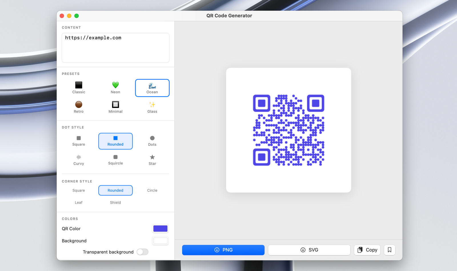 A native macOS SwiftUI application for generating customizable QR codes, built with Swift 6 and the dagronf/QRCode library.