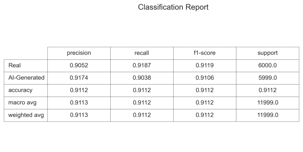 The TrueNet model achieves an overall accuracy of 91.1%, correctly identifying real or AI-generated images in more than 10,900 cases out of nearly 12,000 tested. In practical terms, for every 100 images processed, TrueNet accurately classifies over 91, ensuring reliable verification at scale. With an error rate under 9%, the system strikes the right balance between precision and safety, minimizing false identifications while maintaining strong protection against manipulated or synthetic content.