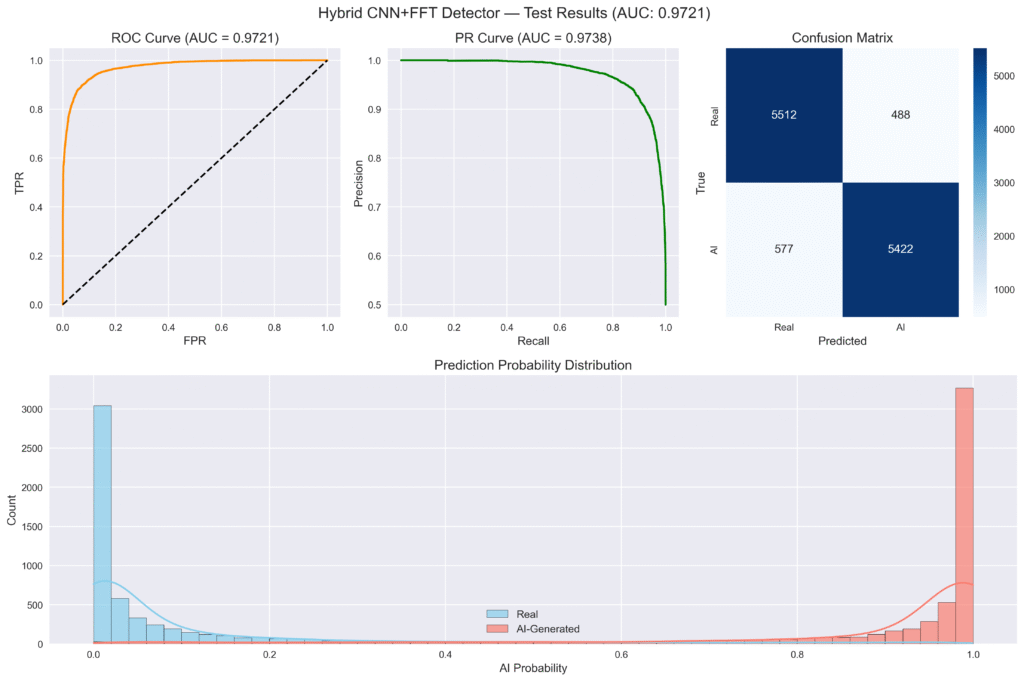 To prove it works in the real world, we tested the model on a completely new set of 11,999 images it had never seen before—6,000 real and 5,999 AI-generated. The results are strong, clear, and ready for production use.
